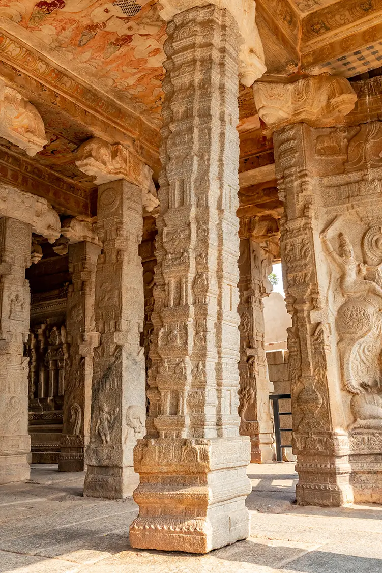 ఆలయ స్తంభాలు రాతితో చెక్కబడిన కథల గ్యాలరీ. ఖచ్చితమైన వివరాలతో చెక్కబడి, అవి హిందూ పురాణాల నుండి దేవతలు, దేవతలు మరియు పురాణ కథనాలను వర్ణిస్తాయి. ఈ స్తంభాలు కేవలం నిర్మాణ మద్దతు మాత్రమే కాదు; వారు కథకులు, దేవతలు, యోధులు మరియు ఖగోళ సంఘటనల కథలను వివరిస్తారు. వాటిలో ప్రసిద్ధి చెందిన వేలాడే స్తంభం ఆనాటి ఇంజనీరింగ్ అద్భుతాలకు నిదర్శనంగా నిలుస్తోంది.